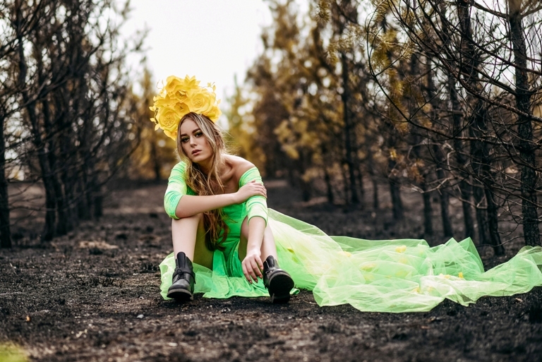На фоне пепелища, оставшегося после лесного пожара на Белянских горах фотографировались участницы конкурса в номинации «Young». Причиной пожара стала безответственность людей, отдыхавших в лесу. Девочки были в нарядах зеленого цвета. Удивительная неординарность костюмов сделала съёмки особенно впечатляющими.
