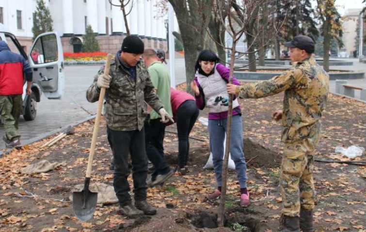 На главной площади города сегодня началась посадка деревьев и кустарников.