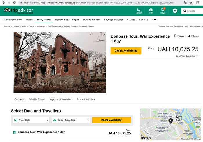 «Война в Украине – самый масштабный и кровопролитный военный конфликт со времен Второй мировой войны. В течение 2014-2019 годов погибли более 10 тыс. военных и гражданских лиц. Война все еще продолжается. У вас может быть возможность стать частью новой европейской истории», – анонсирует туркомпания свое предложение.