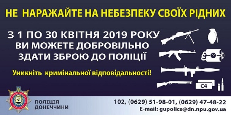 С целью вывода из незаконного оборота оружия, боеприпасов, взрывчатых веществ и профилактики преступлений с их использованием, с 1 апреля в Краматорской оперативной зоне полиция начинает месячник добровольной сдачи опасных предметов.