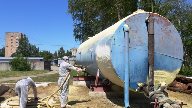 В процессе подготовки к отопительному сезону специалисты начали покрывать на территории котельных резервные баки запаса воды пенополиуретаном. Этот материал защищает от коррозии и позволяет сохранить необходимую температуру воды. Пенопоулиуретановое покрытие можно наносить на конструкции самой разной формы. А еще оно инертно к кислотной и щелочной среде, поэтому его используют для теплоизоляции.