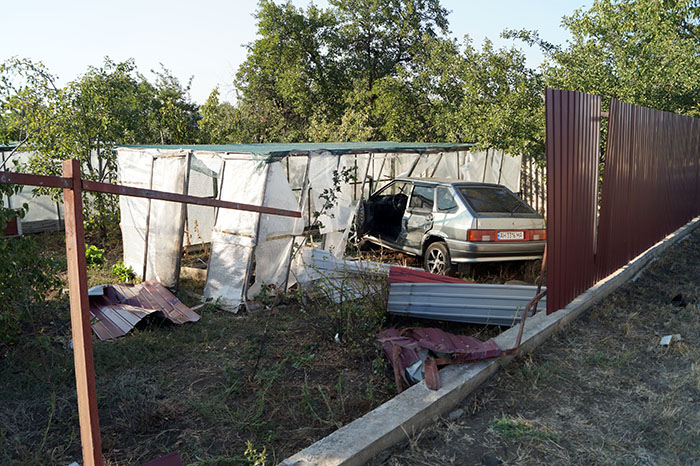 Инцидент произошел в четвертом часу дня. В результате столкновения, основательно помятая "Волга" осталась стоять на перекрестке, а "ВАЗ", сделав длинный неуправляемый маневр, пробил забор частного домостроения и остановился в... теплице.