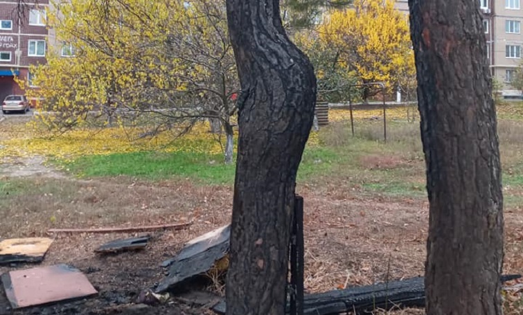 О происшествии сообщает в социальной сети фейсбук Роман Краснощеков. Происшествие произошло по адресу Клубная, 17. Именно там были высажены, а теперь уже и сгорели сосны, которые много лет прослужили жителям.