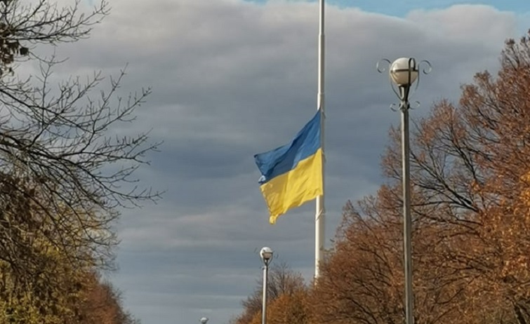 В законе «Про Державний Прапор України» в статье 12, абзац второй говорится: «При піднятті Державного Прапора України на флагштоці у разі трауру Прапор приспускається до середини щогли таким чином, щоб нижній край полотнища знаходився на рівні середини щогли».