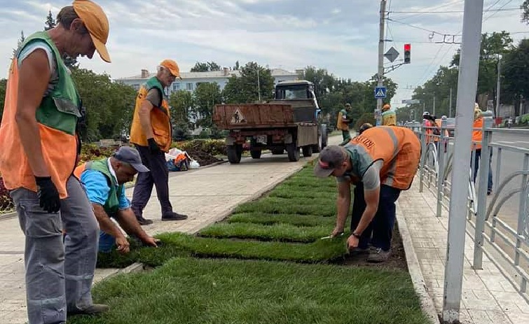 Коммунальщики города проводят работы по облагораживанию территорию вдоль тротуара рулонным газоном.
