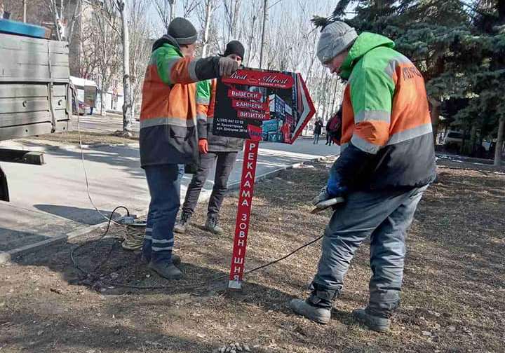 В Краматорске сотрудники КП «УРСАС» демонтируют незаконно установленные рекламные конструкции по ул. Дворцовой.