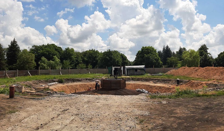 Рабочие готовят станину для заливки, идет работа по вязке арматуры для заливки фундамента. Так же, на данный момент ведутся работы по демонтажу бордюрного камня от автомагазина по ул. Южной до фонтана.