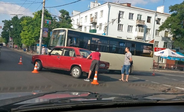 В Краматорске в районе ЦУМа произошло ДТП с участием автобуса и легкового автомобиля "Жигули" красного цвета.