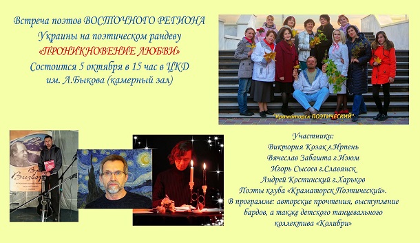 Встреча поэтов восточного региона Украины на поэтическом рандеву "ПРОНИКНОВЕНИЕ ЛЮБВИ" состоится 5 октября в 15-00 в ЦКД им. Л. Быкова (камерный зал).
