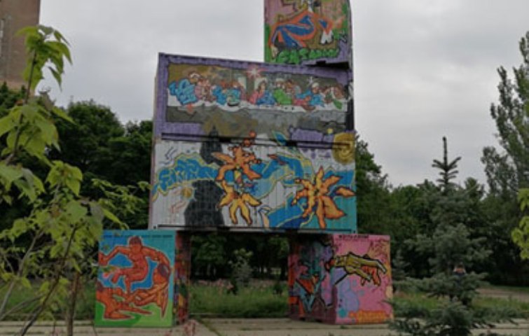 В прошлом году в в Краматорске при входе в парк Юбилейный, на пересечении улиц Парковой и Академической, появилась огромная инсталляция или «арт-объект», представляющий собой несколько разрисованных морских контейнеров. Горожане из тех, кому лень выговорить слово инсталляция, начали звать его просто – конь.
