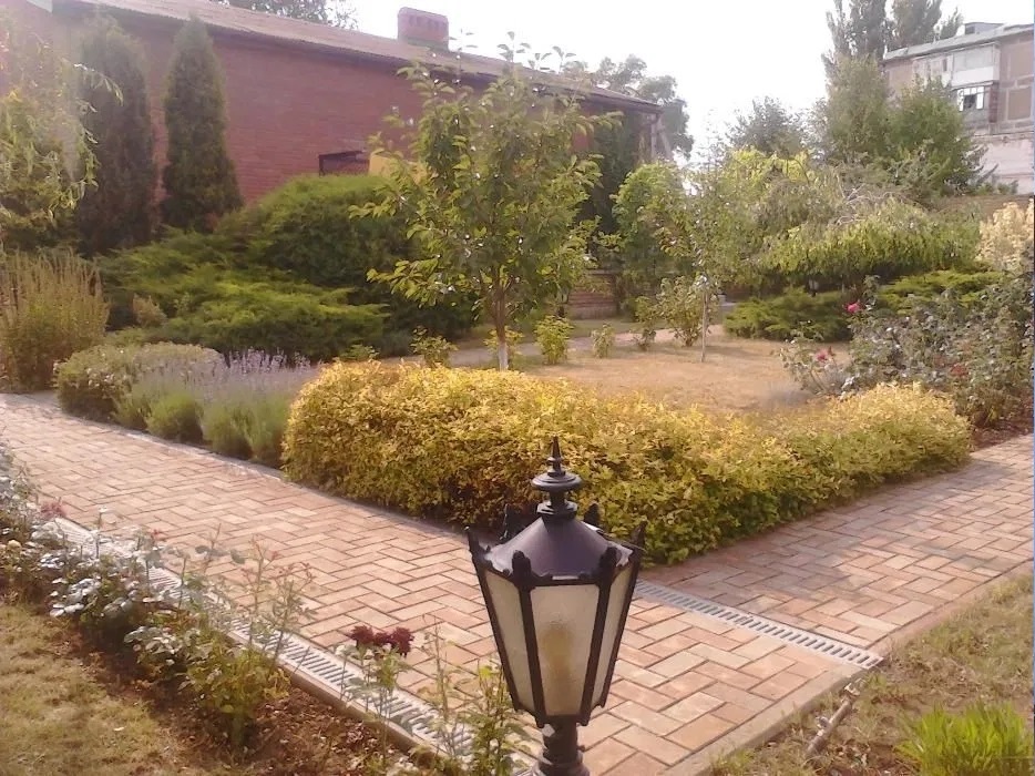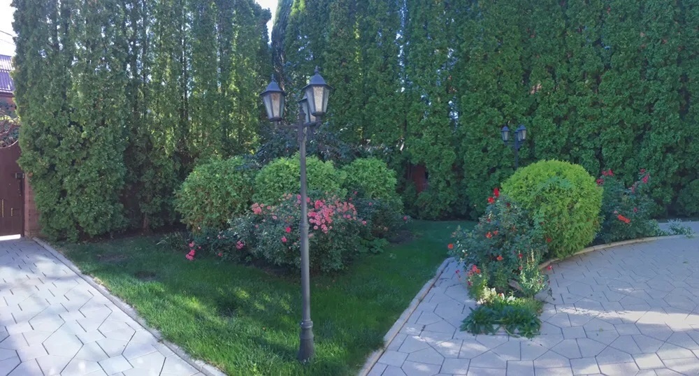 Двор очень просторный, ландшафтный дизайн с большим количеством хвойных деревьев, имеется две беседки.