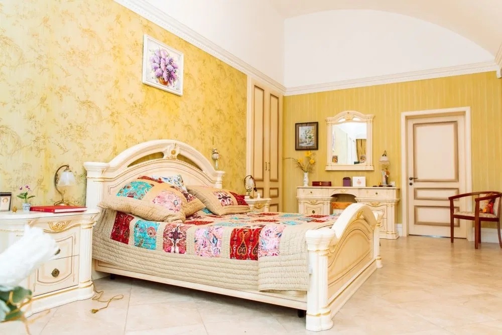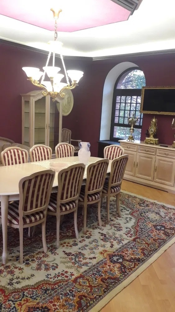 Вся мебель и декор под заказ из Европы. Продумана каждая деталь, очень много люстр, бра, светильников по всему периметру. Высота потолков от 3,3 до 4,5 метров.