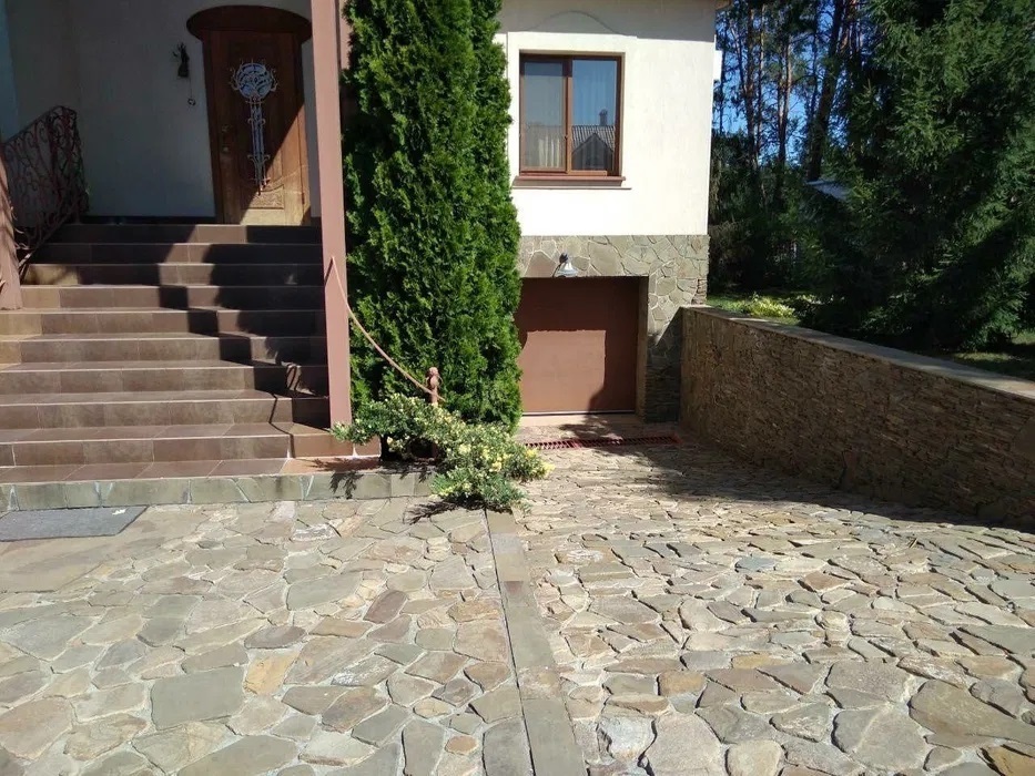 Дом обставлен эксклюзивной мебелью, а придомовая территория оформлена с ландшафтным дизайном: дорожки, склоны, кустарники и плодовые деревья, вьющиеся растения. На участке есть летняя кухня, гараж на два автомобиля и подсобные помещения.