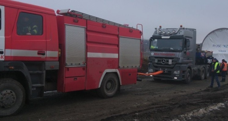Бойцы 12-го Государственного пожарно-спасательного отряда, которые выехали на место происшествия, с помощью буксировочного троса и автоцистерны отбуксировали грузовик на подъем.