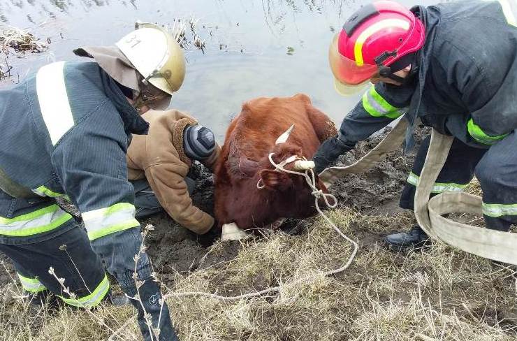 Бойцы ДСНС с помощью веревки и лебедки вытащили корову, которая застряла в реке, берег которой имеет крутой спуск.