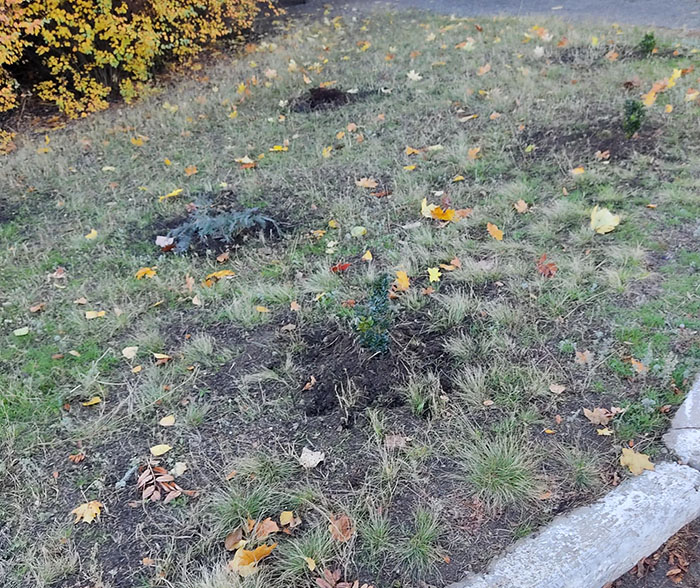 Сегодня, 10 ноября, директор Центральной библиотеки Краматорска Елена Помоз поделилась в Facebook печальной новостью: ночью неизвестное ворье выкопали и унесло несколько деревьев туи, которые были высажены здесь всего 2 недели назад.
