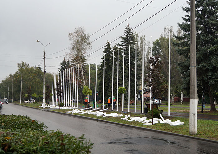 На бульваре Машиностроителей в Краматорске, напротив здания налоговых органов, сегодня идет возведение целого леса белых флагштоков. Естественно, у всех прохожих появляются вопросы: что это и зачем?