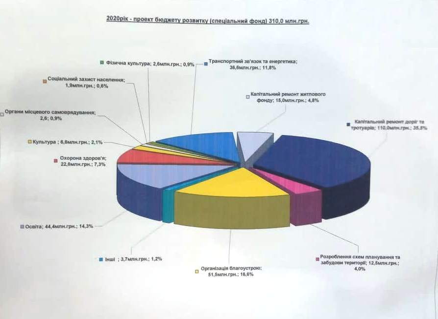 А 17 декабря в горсовете презентовали проект бюджета развития (специального фонда) на сумму 310 млн. грн. Из них 35,5% (110 млн. грн.) составляли расходы на капитальный ремонт дорог и тротуаров, благоустройство города - 16,6% (51,5 млн. грн.), образование – 14,3% (44,4 млн. грн.), транспортную связь и энергетику - 11,8% (36,6 млн. грн.), здравоохранение – 7,3% (22,6 млн. грн.) капремонт жилого фонда - 4,8% (15 млн. грн.), культуру – 2,1% (6,6 млн. грн.), органы местного самоуправления – 0,9% (2,6 млн. грн.), физическую культуру – 0,9% (2,6 млн. грн.), соцзащиту населения – 0,6% (1,9 млн. грн.).