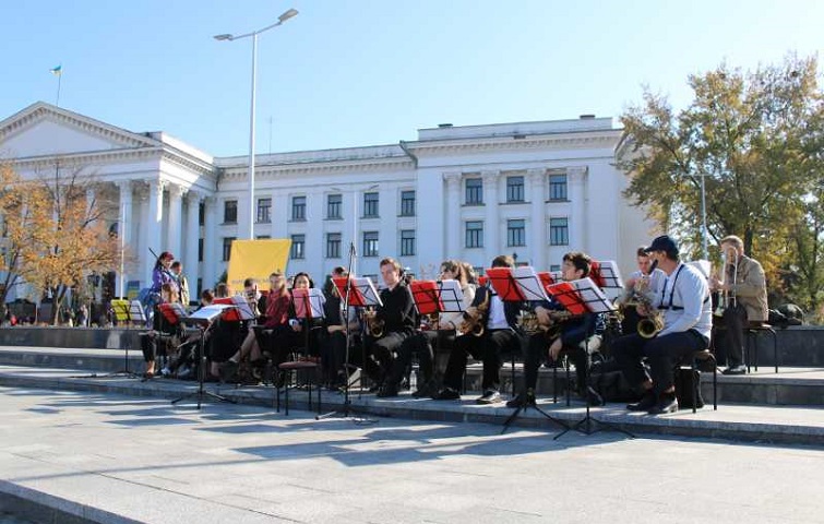 В 14-00 здесь все пять оркестров исполнили новый марш украинской армии, а оркестр 94-го понтонно-мостового отряда, покажет свое музыкальное шоу.