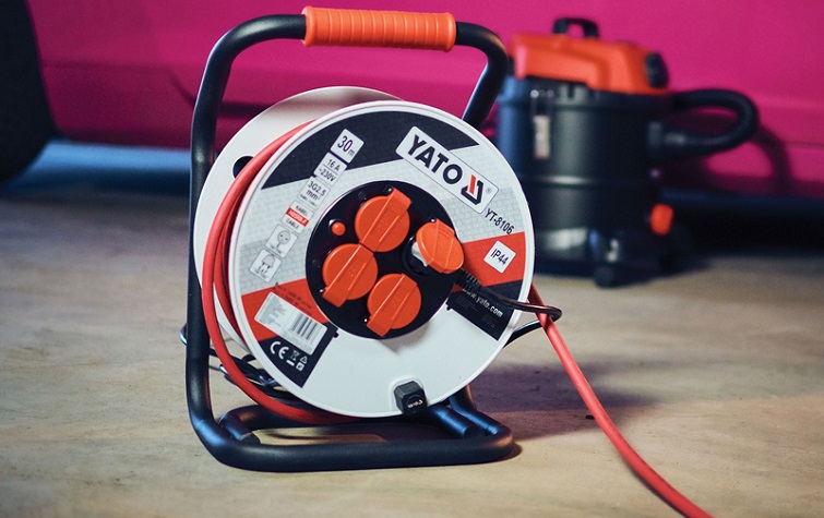 - З виносною розеткою. По суті, тут маємо звичайний подовжувач для під’єднання одного пристрою, який намотаний на котушку. Вони не є єдиним цілим. Не дивлячись на це, така конструкція набагато зручніша у користуванні, адже зайва довжина кабелю не плутається під ногами. При цьому вилка залишається статичною, а відмотується той кінець, на якому знаходиться розетка. Завдяки цьому апарат стоїть на одному місці, а для переміщення далі потрібно просто відмотати електрошнур. Це пречудовий варіант для будь-якого мережевого інструменту, адже навіть із супер-коротким кабелем буде комфортно працювати.