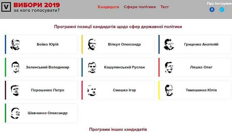 Для отражения в инструменте были выделены кандидаты, занимающие первые 10 ступеней в трех национальных рейтингах (Фонд “Демократические инициативы”, Киевский международный институт социологии, Социологическая группа «Рейтинг»). Кандидаты представлены в алфавитном порядке. Остальные кандидаты в президенты представлены в проекте ссылками ни их предвыборные программы, без возможности задействовать аналитический инструмент.
