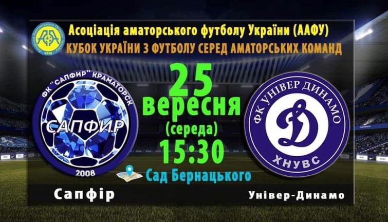 25 сентября в 15:30 на футбольном поле Сада Бернацкого состоится матч-реванш между ФК "Сапфир" (Краматорск) и ФК "Универ-Динамо" (Харьков) в пределах 1 \ 8 финала Кубка Украины по футболу среди любительских команд.