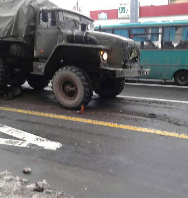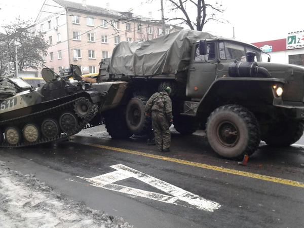На фото, выложенных очевидцами аварии в сеть, также виден российский зенитно-ракетный комплекс «Стрела-10» в походном положении. По словам людей, едущий следом ЗРК не справился с управлением и врезался в грузовик. На этом участке улица Университетская имеет несколько полос одностороннего движения в северном направлении, и одну отдельную полосу для маршрутного транспорта - троллейбусов и автобусов. На фото видно, что техника боевиков двигалась по встречной полосе.