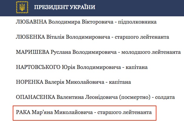 "Старший лейтенант Марьян Рака был отмечен государственной наградой за самоотверженную службу и защиту независимости и территориальной целостности Украины", — говорится в сообщении.