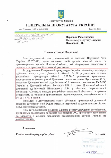 Генеральная прокуратура открыла уголовное производство по фактам участия мэра Донецка Александра Лукьянченко и бывшего главы Донецкой облгосадминистрации Андрея Шишацкого в деятельности ДНР. Об этом говорится в ответе ГПУ на запрос народного депутата Натальи Веселовой, фото которого размещена на сайте Новости Донбасса.