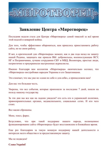 "Для того, чтобы эффективно обороняться, нам пришлось приостановить работу сайта, но не свою работу. И вот, в критический для Миротворца момент, как и два года назад на защиту нашей Родины, защищать нас пришли ВЫ: добровольцы, военнослужащие ВСУ, НГ и Пограничники, лучшие сотрудники СБУ и МВД, волонтеры, простые люди, патриотично и проукраински настроенные журналисты", - говорится в обнародованном заявлении.