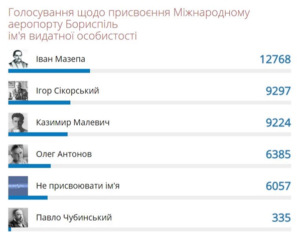 Против присвоения аэропорту чьего-либо имени выступили 6057 человек. Меньше всего голосов (335) набрал автор текста гимна Украины Павел Чубинский.