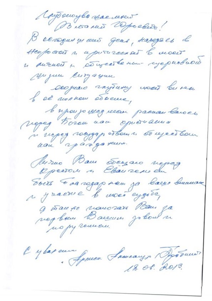 В сегодняшний день, находясь в непростой и критической в моей и личной и общественно церковной жизни ситуации осознаю глубину моей вины в ее полном объеме, в произошедшем раскаиваюсь перед Богом как христианин и перед государством и обществом как гражданин.