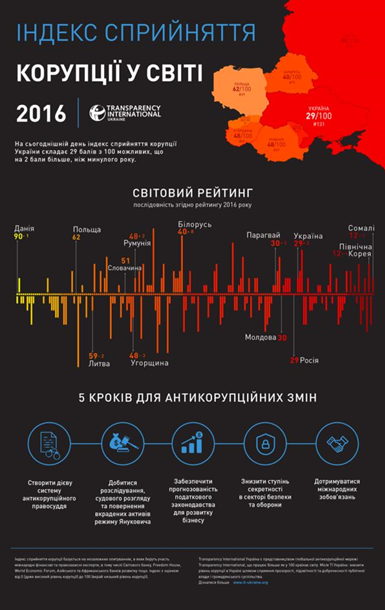 Украина улучшила показатели благодаря внедрению антикоррупционной реформы. Однако, как отмечают в организации, отсутствие действенной судебной системы и фактическая безнаказанность коррупционеров не дает Украине сделать мощный рывок вперед и преодолеть 30-балльный барьер