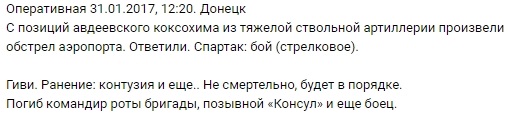 "Гиви. Ранение: контузия и еще.. Не смертельно, будет в порядке. Погиб командир роты бригады, позывной Консул и еще боец", - сказано в сообщении.