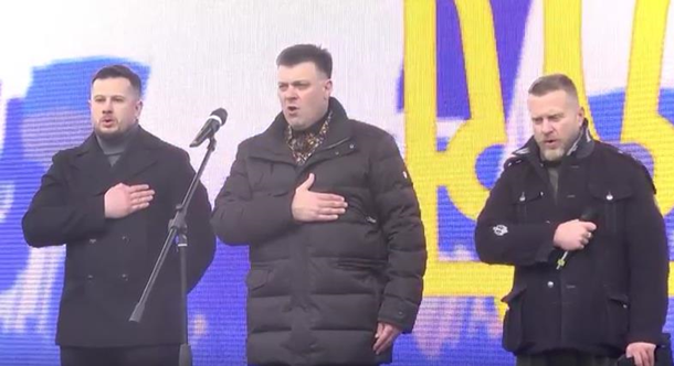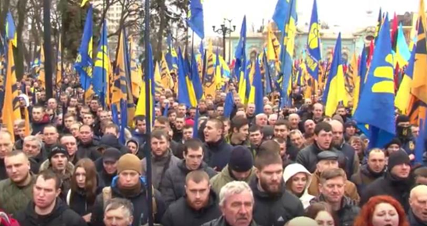 Правые националистические партии "Свобода", "Национальный корпус" и "Правый сектор" провели 22 февраля в Киеве "Марш национального достоинства", на котром объявили "ультиматум" власти. Они прошли до парламента и провели митинг под Верховной Радой. Выступали лидеры "Свободы" и ПС. Люди скандировали лозунги "Слава нации - Смерть врагам", а также спели гимн Украины. Некоторые кидали пиротехнику.