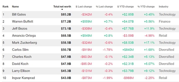 Также в рейтинге Bloomberg несколько бизнесменов из России. На 52 месте Владимир Потанин с $16,5 млрд. На 103 месте разместился бизнесмен Геннадий Тимченко с $11,4 млрд, а на 217 позиции находится Олег Дерипаска с $6,63 млрд.