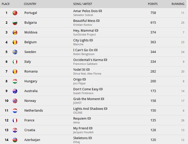 Третье место с 374 баллами заняла Молдова. Украина заняла на Евровидении 24 место.
