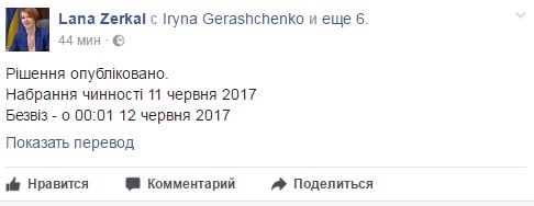 "Решение опубликовано. Вступление в силу 11 июня 2017 года. Безвиз – в 00.01 12 июня 2017 года", – написала она.