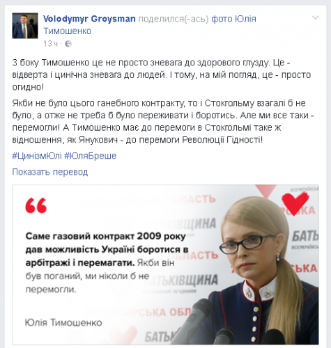 Премьер-министр Украины резко и категорично выразился по поводу высказывания Юлии Тимошенко и причастности к победе в Стокгольмском суде. Об этом Гройсман сообщил на своей странице в Facebook.