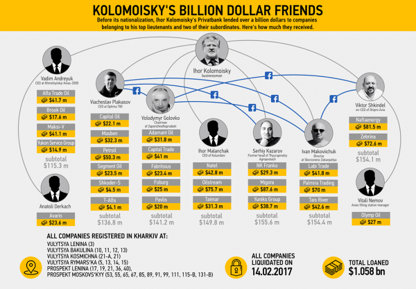 По данным расследования OCCRP, девять человек получили один миллиард долларов от ПриватБанка перед национализацией.
