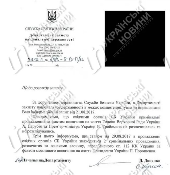 Согласно ответу, по состоянию на 29 августа в производстве СБУ находятся два производства по статье 112 Уголовного кодекса по факту возможного посягательства на жизнь главы государства.