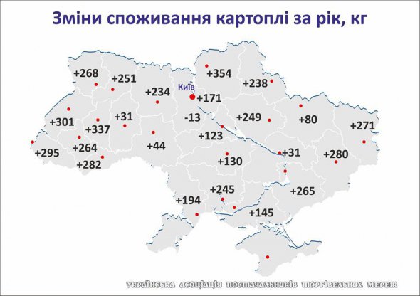 "До п'ятірки лідерів зі збільшення споживання картоплі за рік входить Чернігівщина, яка додала 354 кілограм. Тернопільщина додала 337 кілограм, Дніпропетровщина - 317 кілограм, Львівщина - 301 кілограм, Закарпатська область - 295 кілограм. Водночас у Київській області на 13 кілограм зменшилось споживання картоплі. Найменші темпи зростання купівельної спроможності в картоплі у Хмельницькій, Вінницькій, Харківській та Черкаській областях", - написав у Facebook директор асоціації постачальників торговельних мереж Олексій Дорошенко.