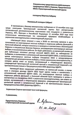 Письмо представителя Украины в Трехсторонней контактной группе, экс-президента Украины Леонида Кучмы с согласованным текстом "формулы Штайнмайера" обнародовано в российской газете "Коммерсант".