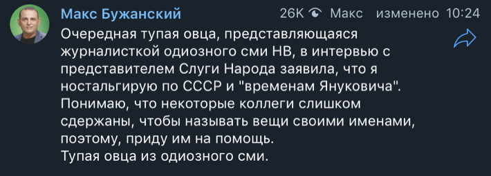 "Очередная тупая овца, представляющаяся журналисткой одиозного сми НВ, в интервью с представителем "Слуги Народа" заявила, что я ностальгирую по СССР и "временам Януковича". Понимаю, что некоторые коллеги слишком сдержаны, чтобы называть вещи своими именами, поэтому, приду им на помощь. Тупая овца из одиозного СМИ", - написал Бужанский в Telegram.
