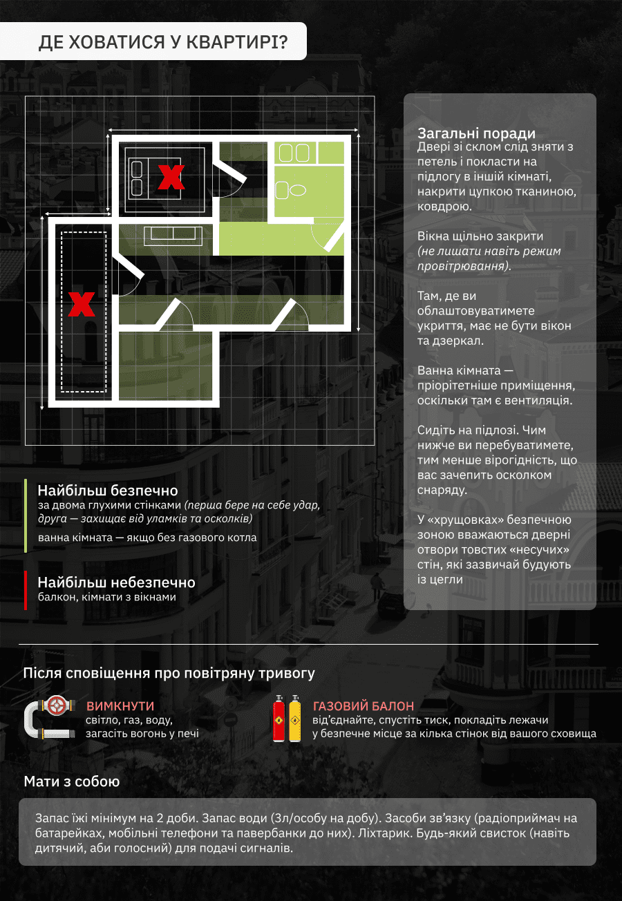 Если рядом с вами нет укрытий, найдите наиболее защищенное место в своей квартире, пользуясь инструкцией: