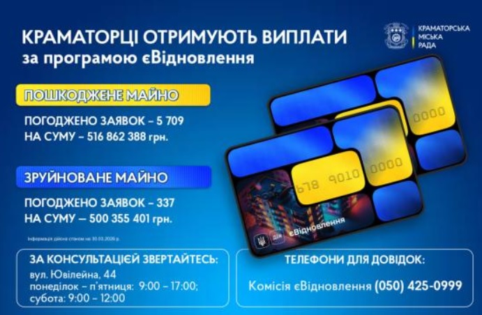 Станом на 30 березня 2026 року загальний обсяг нарахованих виплат мешканцям Краматорська в межах державної програми єВідновлення склав 1 017 217 789 гривень, про що інформує Краматорська міська рада.