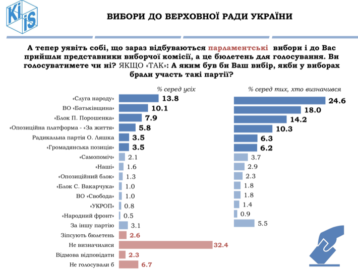 Среди тех избирателей, которые определились, за кого голосовать, 24,6% проголосовали бы за партию "Слуга народа", 18% - за "Батькивщину", 14,2% - за "БПП", 10,3% - за "Оппозиционную платформу-За Жизнь", 6,3% - за "Радикальную партию" и 6,2% - за "Гражданскую позицию".