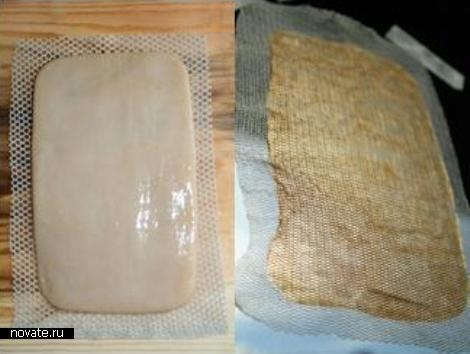 На фотографии выше бактериальная целлюлоза еще не готова к обработке. Она еще только сушится на шерстяной подстилке. Пока материя уже не слишком мокрая, но и не слишком сухая, их ее пластов примерно намечают будущую вещь и скрепляют куски для получения большого цельного материала. Когда процент высыхания еще не стопроцентный, но близок к этой отметке, ткань кроят и обшивают, делают из нее полноценную вещь.