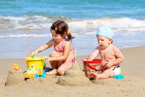 - Поиграй с крохой у кромки моря. Можно делать куличики, строить замки или рисовать палочкой на мокром песке. Заигравшийся малыш может и не заметить, как волна нежно ласкает маленькие ножки. Вырой большой ров для замка, который сразу же заполнится водой. Крохе наверняка понравится играть в нем. А близкое соседство моря уже не так тревожит, как раньше.