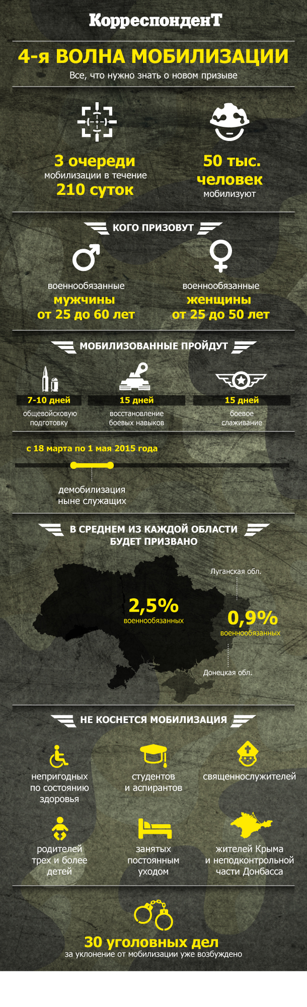 Напомним, 14 января президент Петр Порошенко подписал указ о четвертой волне мобилизации. Мобилизация будет проводиться в течение 2015 года в три очереди в течение 210 суток.